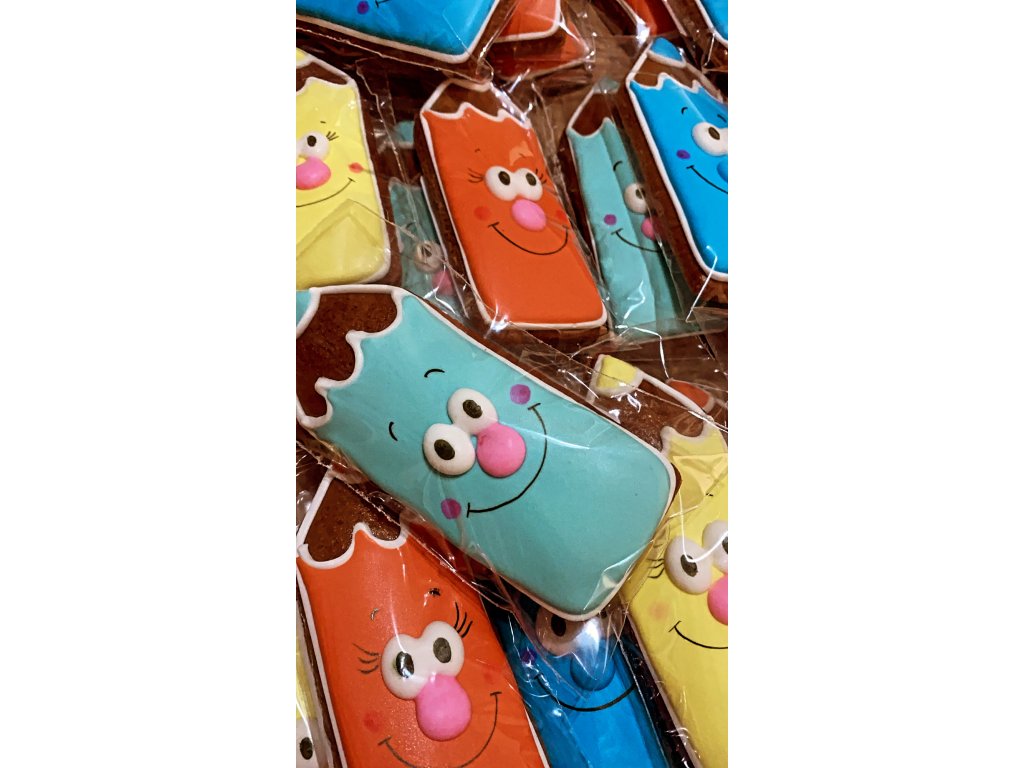 Složení: pšeničná mouka, cukr, med, vejce, máslo, kakao, kypřící prášek do perníku, jedlá soda, směs koření. Perníčky obsahují potravinářské barvy dle vzoru.